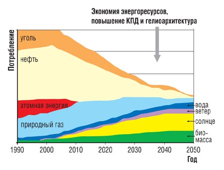 При проведении исследования принимали во внимане только имеющиеся сегодня на рынке технологии, и предполагалось, что уровень жизни в европейских странах будет уравниваться. Так, к 2050 году 90% энергии, потребляемой европейскими странами, вполне может быть произведена с использованием возобновляемых энергоресурсов (рис. 1). При этом цена на электроэнергию увеличится в два раза, но в то же время и потребление энергоносителей уменьшится вдвое. Практически треть энергии будет производиться из биомассы.