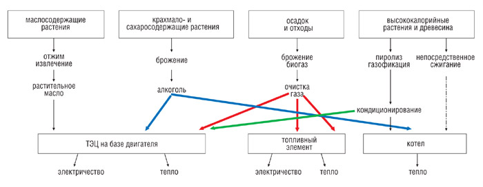 Биомасса — это общий термин для обозначения органических продуктов и отходов (жидкий навоз, зерновые остатки, масличные и сахаросодержащие культуры), промышленных и бытовых отходов, древесины, отходов пищевой промышленности и др. Сухую биомассу можно сразу использовать в качестве топлива, в других случаях ее можно преобразовать в биогаз путем «сбраживания», газификации или выпаривания (рис. 2).