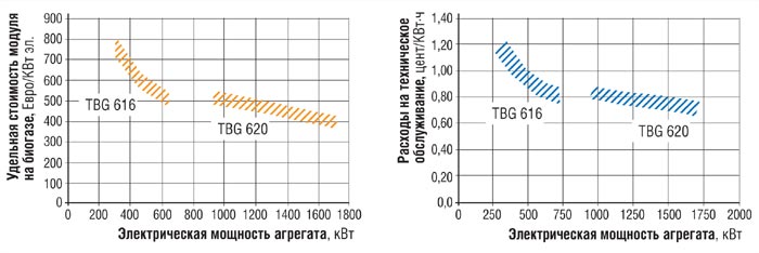 На рис. 8 показаны удельные капиталовложения и средние расходы на техобслуживание установок, работающих на биогазе. Данные обобщают опыт эксплуатации установок серии TBG 616 и TBG 620. Они включают затраты на газопоршневой агрегат, теплообменники для охлаждающей жидкости и отработавших газов, шумоглушители, а также расходы на распределительную установку, включая монтаж и систему трубопроводов. С 2005 года установки серии TBG были модернизированы в серию TCG 2016 C и TCG 2020, соответственно.